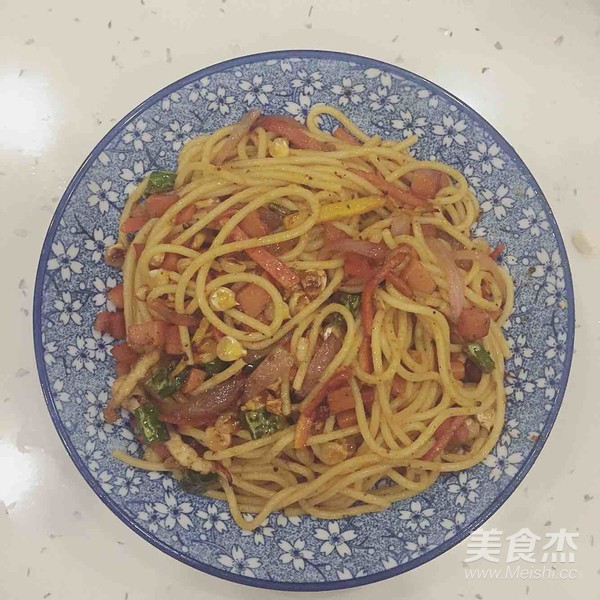 所有的配菜放油翻炒,先后順序以易熟的程度為主。再將所有意面放入鍋中,加入適量意大利醬。再翻炒起鍋。