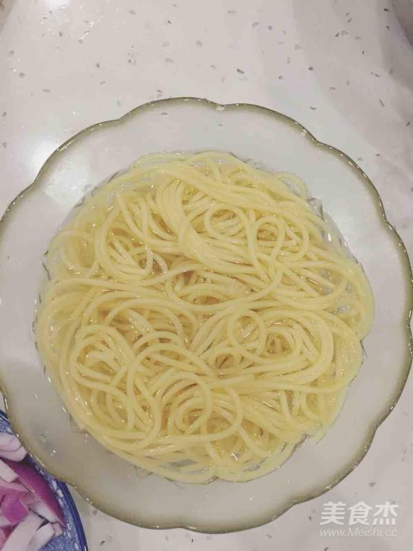放適量意面入鍋,直到意面中間無白心,就可以起鍋,放冷水里冷卻以備用。