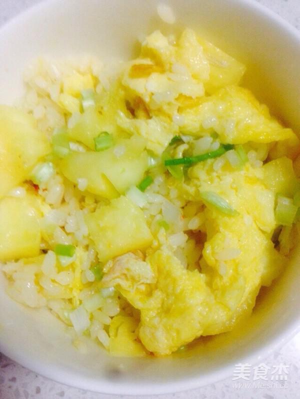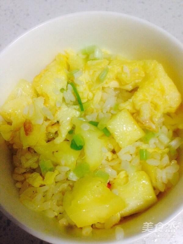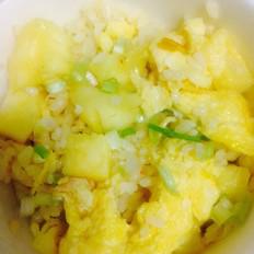鍋里倒入適量的油燒熱后,倒入米飯翻炒至熱透,加入雞蛋炒勻后,再加入菠蘿翻炒均勻,最后加入食鹽調味