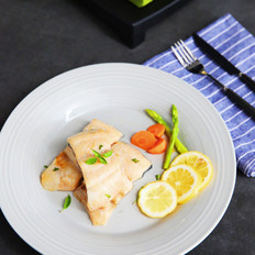 將蘆筍和紅蘿卜焯水后擺盤上,放上沙巴魚、羅勒葉和檸檬片即可。