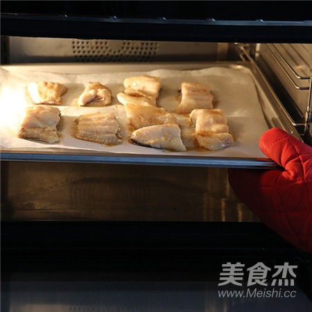 將調(diào)料淋在魚身上,腌制30分鐘。