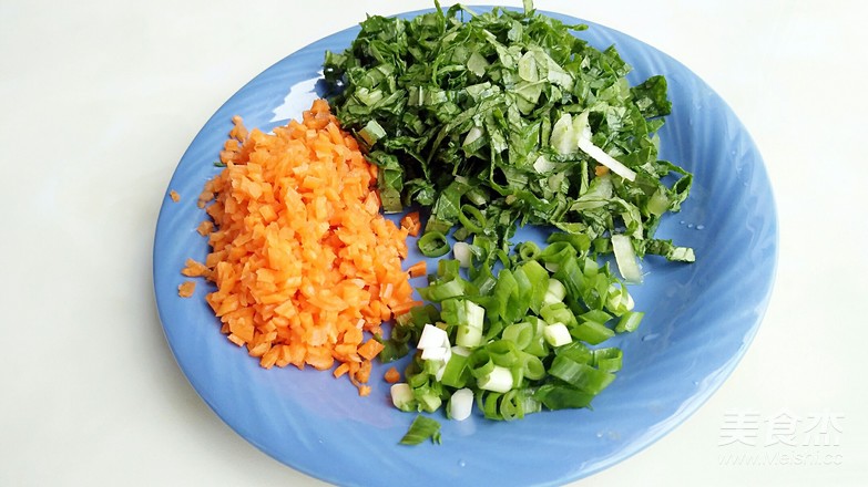 胡蘿卜去皮切成小丁,蔥切碎,小菜切碎。