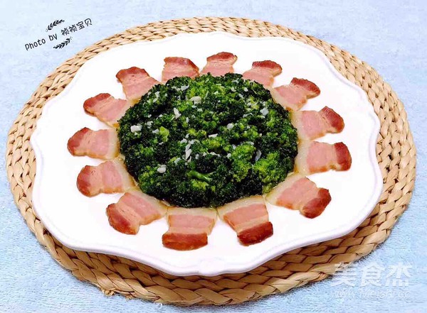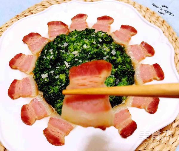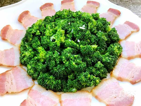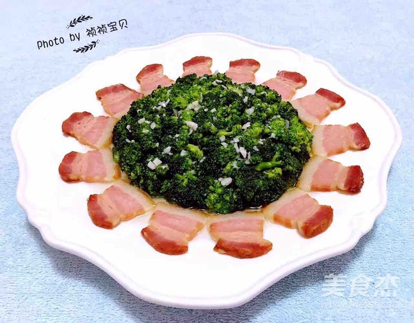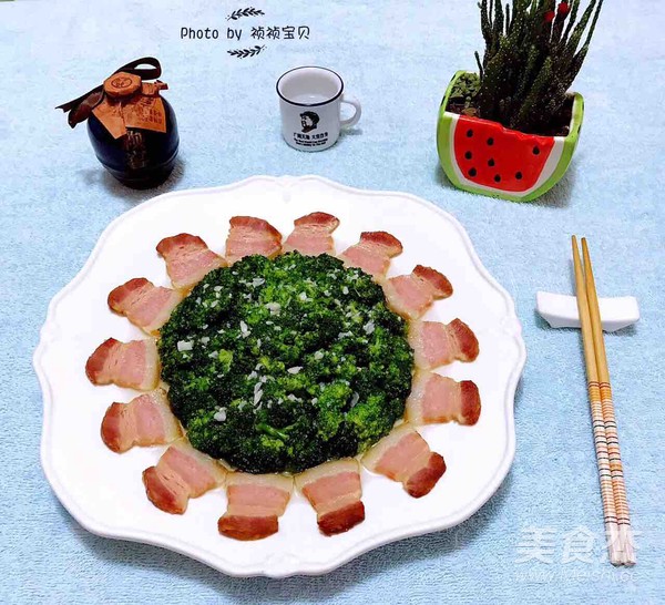9.蒜蓉西蘭花擺入盤中五花肉擺在外圍好漂亮哦做好的芡汁均勻的淋在西蘭花上即可