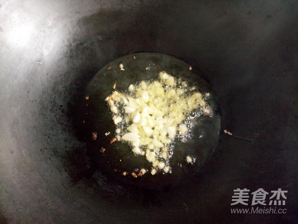 鍋燒熱倒入油燒至七成熱,加入蒜炒出香味。