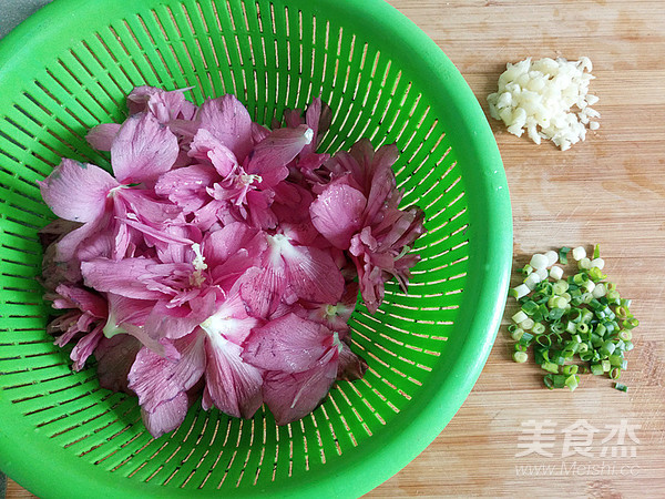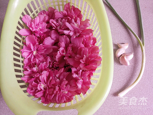木槿花洗干凈控水,蒜瓣去皮切末、蔥洗凈切末。