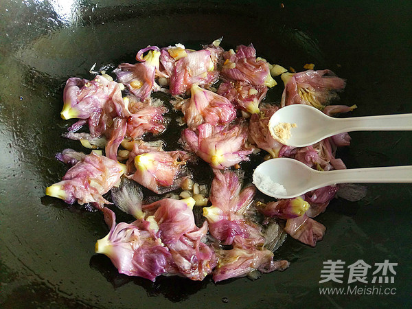 木槿花沾到熱油即刻就熟,翻炒兩下加入鹽和雞粉調味即可。
