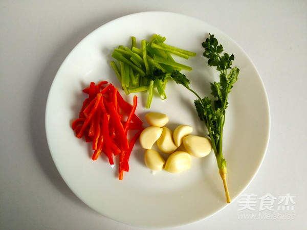 3.準備好青紅尖椒絲、大蒜30克、香菜1棵;