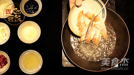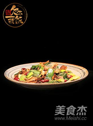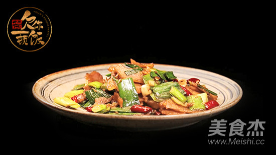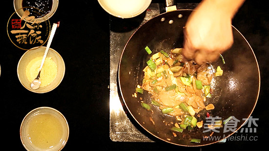 加入大蒜苗,在鍋中翻炒兩分鐘,加入一點水,加入雞精、胡椒