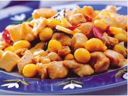 [做法]白果去殼,在油鍋內煸炒至六成熟,撈出剝去薄衣待用。雞肉切成1厘米見方的小丁,放在碗內加入蛋清、食鹽、淀粉攪拌均勻。炒鍋燒熱放油(量要多些),待油燒至六成熟時,將雞丁下鍋用勺劃散,放入白果繼續翻炒,至熟后連油一同倒入漏勺內瀝去油。再在鍋內倒入少量油,將蔥段煸炒,隨即烹入紹酒、高湯、食鹽、味精,把加工過的白果雞丁倒入鍋內翻炒,用濕淀粉勾薄芡,出鍋前淋入香油,攪拌均勻起鍋裝盤即成。