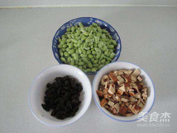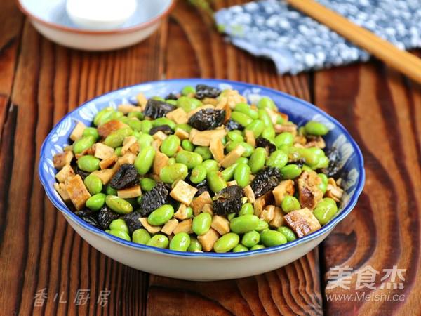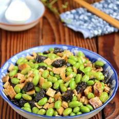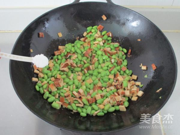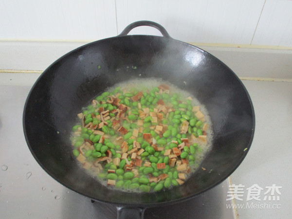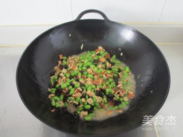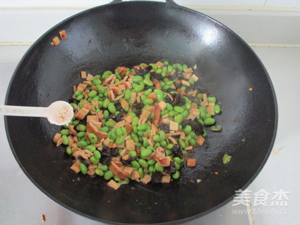 再把香干丁和毛豆子倒入不斷的煸炒至毛豆變色出香味加鹽調味