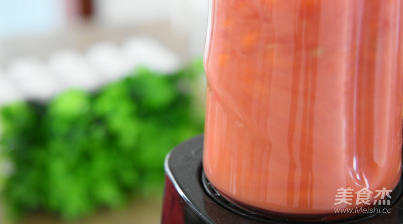 將胡蘿卜丁、番茄丁放入大汁機(jī)種,打成汁