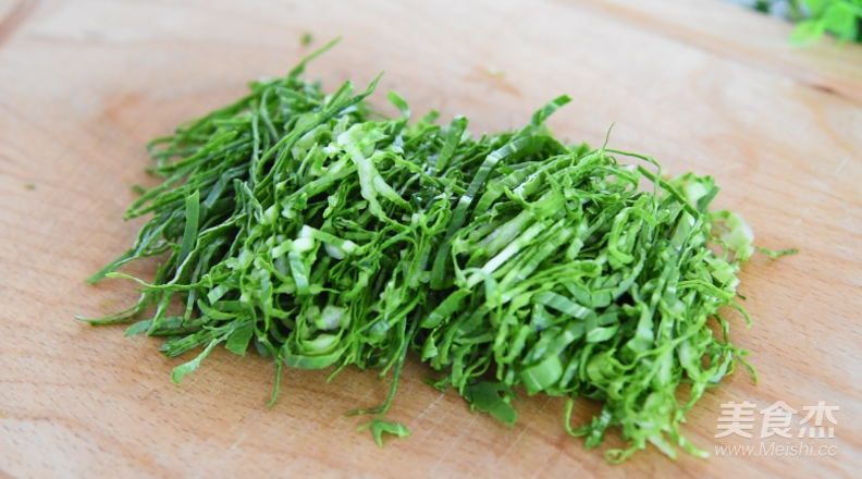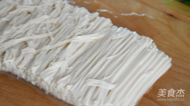 湯汁濃稠后,倒入豆腐絲、青菜絲,順時針拌勻