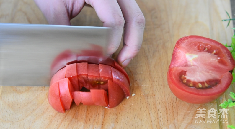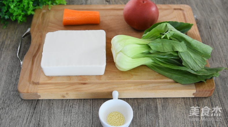番茄 1個、青菜 1棵、雞精 3g、鹽 4g、水淀粉 20g