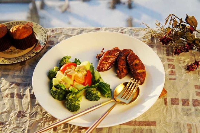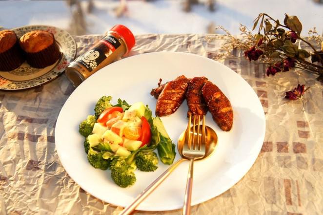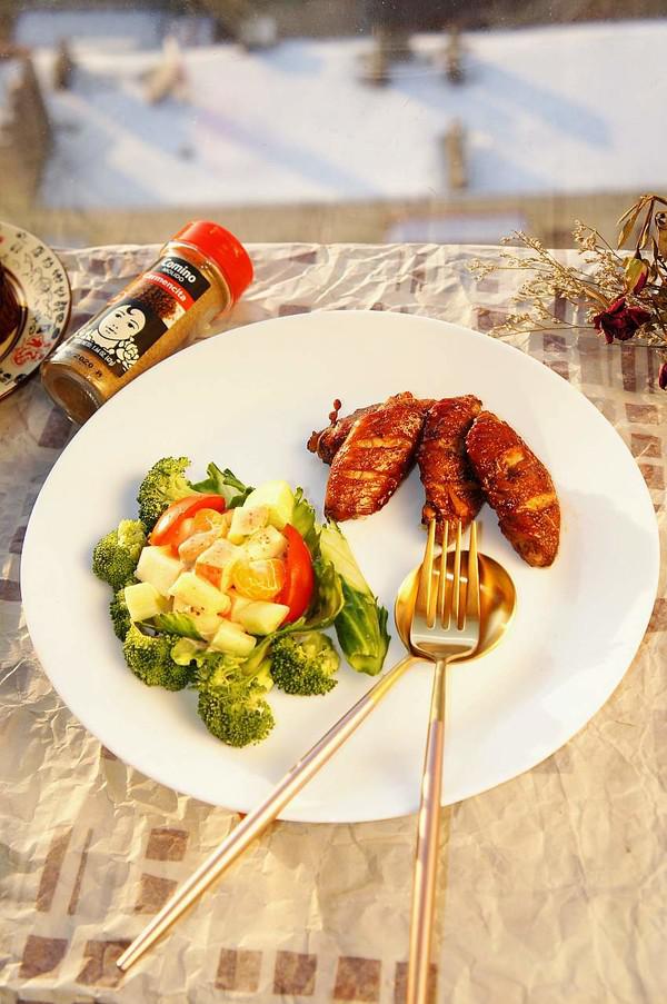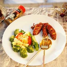 西蘭花焯水,黃瓜、蘋果、番茄洗凈切丁,砂糖橘去皮取瓣,合在一起撒些沙拉汁,香而不膩的孜然翅中,搭配爽口的蔬菜水果沙拉,解饞又爽口,太美味,好吃到停不下來的感腳!