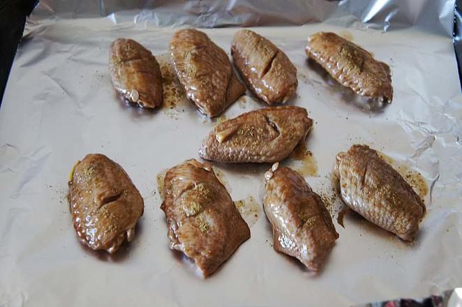 腌制好的翅中兩面撒上卡蒙孜然粉,碼入烤盤