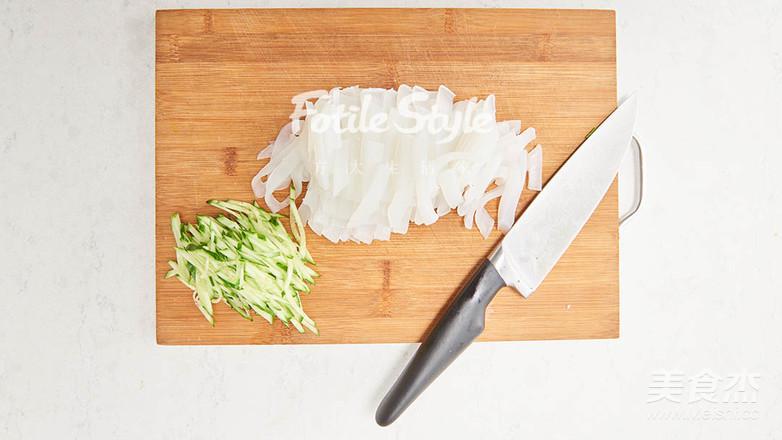 拉皮切成寬窄合適的長條狀,黃瓜切成絲,放入冰箱冷藏待用