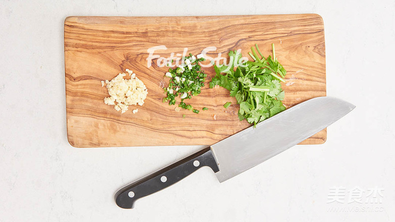 小蔥切蔥花、蒜切蒜末、香菜切碎