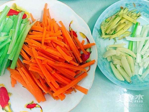胡蘿卜,芹菜,蔥,姜切絲備用,蒜拍一下就好