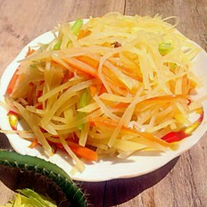 土豆絲泡過后清洗幾遍把淀粉洗干凈炒時不易糊鍋\n炒土豆絲時要用大火快速翻炒