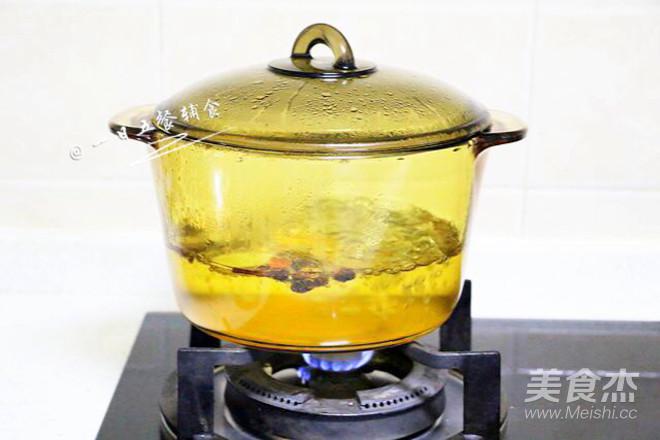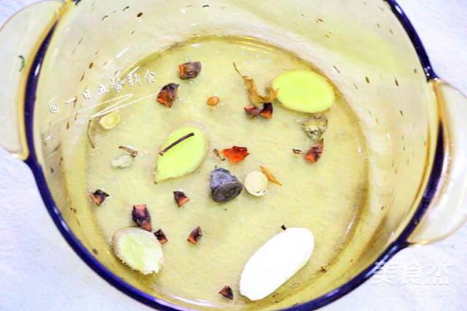 3.砂鍋內(nèi)加入蔥、姜、八角、桂皮、香葉、花椒、冰糖(香料有什么放什么)。