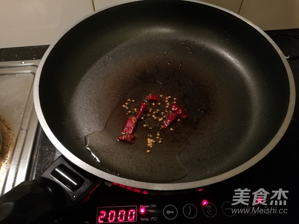 鍋中放適量植物油,并將兩個(gè)干辣椒掰開(kāi)放入,小火慢炸