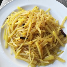 待油溫升高后放入土豆絲(從水中撈出來(lái)直接放入即可),加入少許花椒面,翻炒