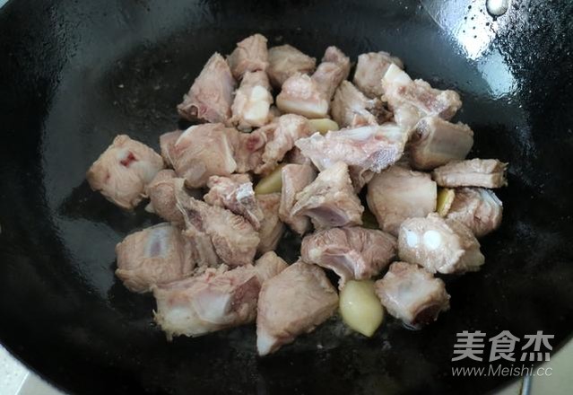 將生姜、蒜瓣入鍋爆香后,放入排骨翻炒一會(huì),放入鹽、生抽、耗油繼續(xù)翻炒。