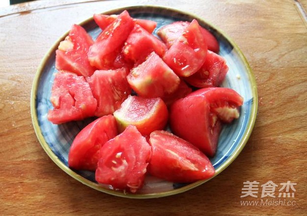 西紅柿用開水燙一下,去掉薄皮后切成塊狀。