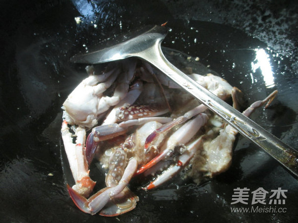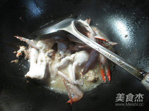 燒鍋4湯勺油燒熱,下入收拾好的螃蟹,加1湯勺料酒。