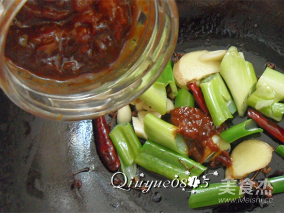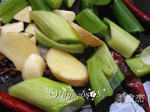 再起鍋,放花椒、干辣椒、蔥姜蒜爆香