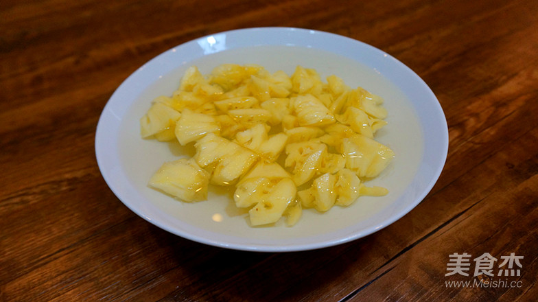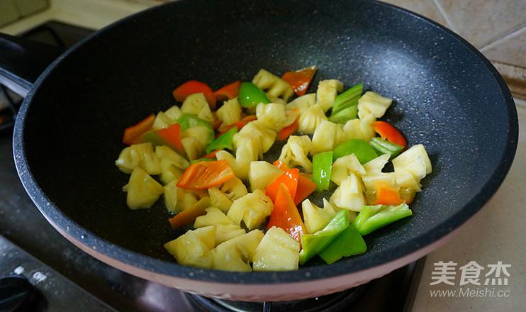 鍋里放一些油,青椒菠蘿炒至六七分熟撈起來待用