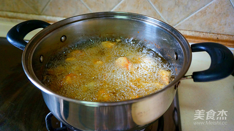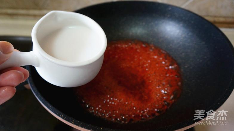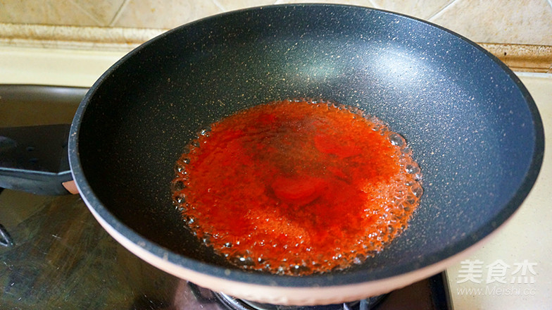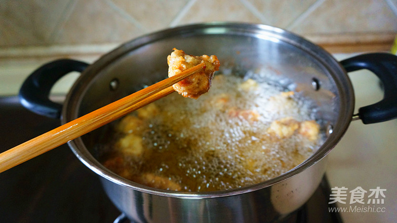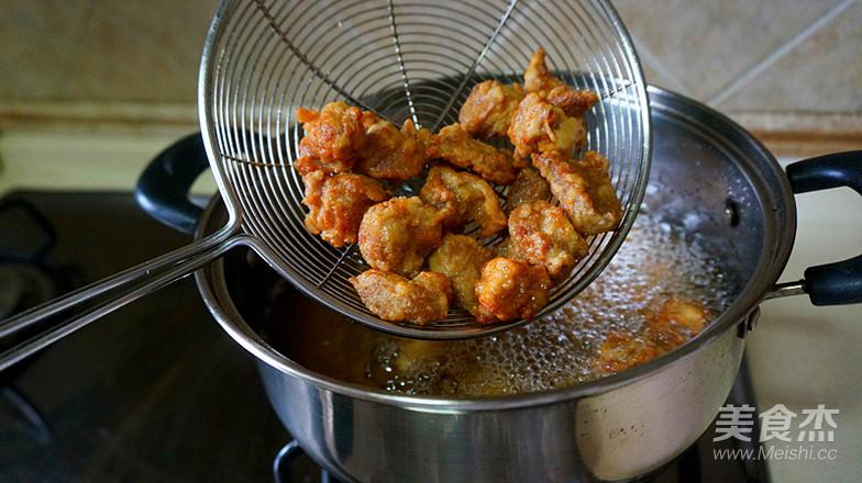 等汁兒完全融合后放入炸好的肉,翻炒至全部裹上醬汁