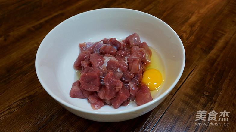 剛腌制好的肉里打入一個雞蛋,完全的攪拌均勻