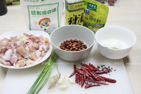 2.將雞腿洗凈剁成2-3厘米的小塊,放在碗中,加入1湯匙料酒、1茶匙鹽、2湯匙水淀粉拌勻,腌制20分鐘入味,1小塊姜、3瓣蒜分別切片,小蔥切2厘米段備用,20個干辣椒剪成小段備用