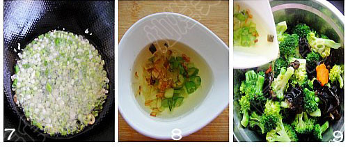 9.將蔥油倒入西蘭花中,加少許鹽、雞精調味即可。如果不喜歡蔥油味,可以放些蒜蓉,味道更經典