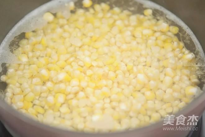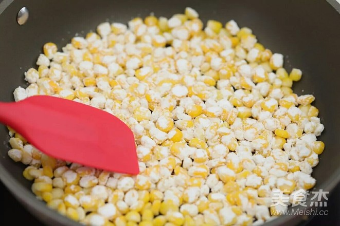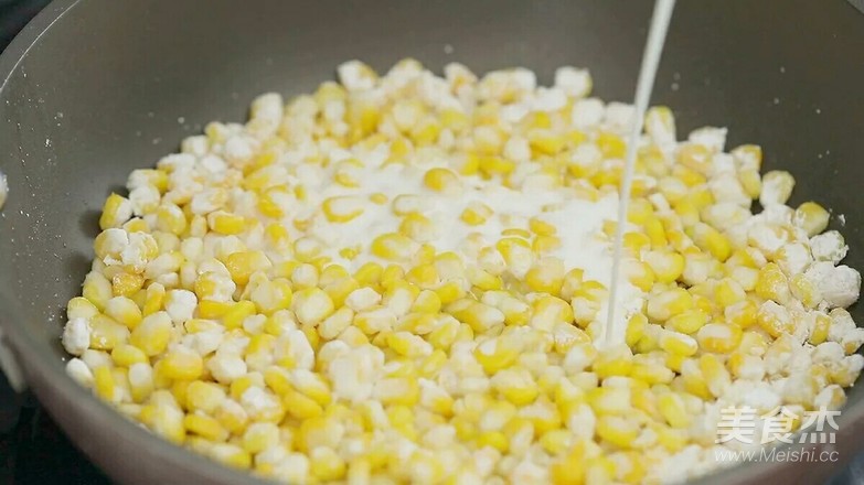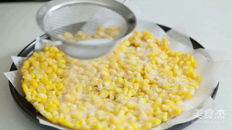 水淀粉倒入玉米粒上,煎至無水狀態(tài),再倒入沒過食材的食用油炸3-5分鐘,炸至玉米粒金黃酥脆就可以出鍋了