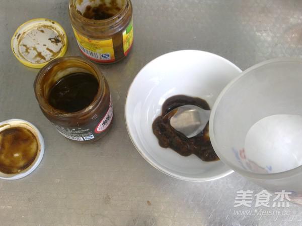 加一勺燒烤醬和一勺黃豆醬,加少許水稀釋下攪勻。