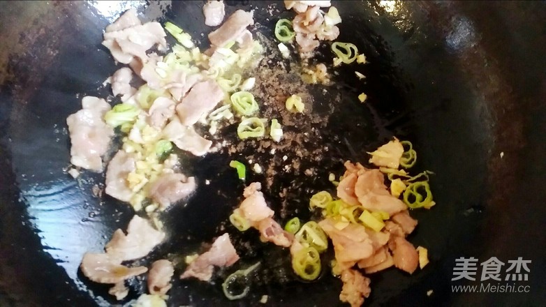 油燒熱,倒入肉片,炒熟,倒入蔥姜末,花椒面,炸鍋,炒出香味。