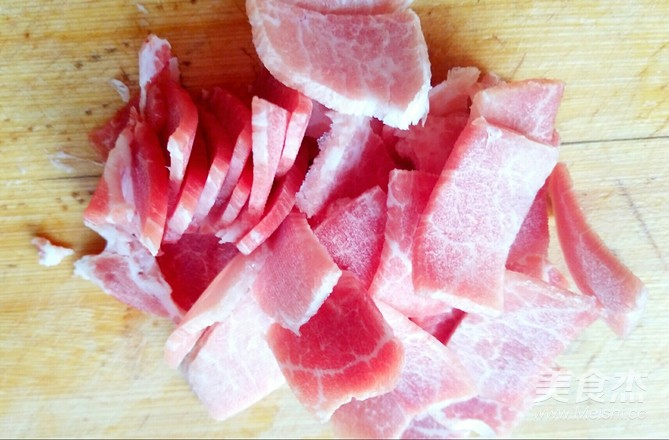 在燒水焯香菇的時候,就可以準備炒菜材料了:肉切成片