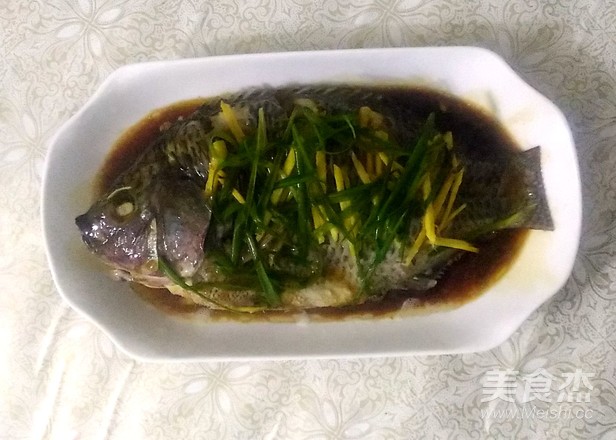 將蒸好的魚擺入盤中,擺入切好的姜絲和蔥絲