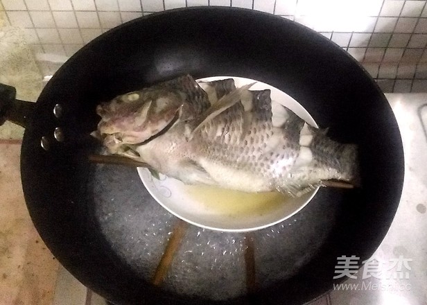 鯽魚洗凈,在兩面切幾刀加入適量鹽腌10分鐘,蔥和姜切絲