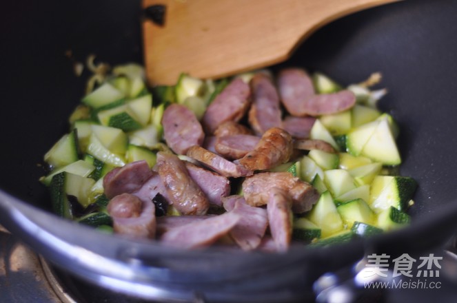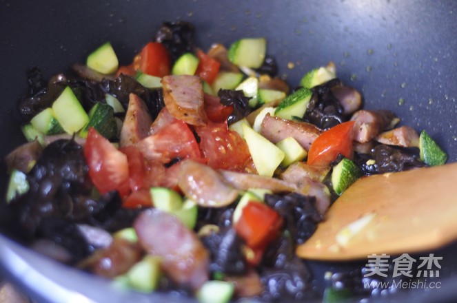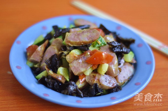 出鍋前,加入準備好的西紅柿做點綴,西葫蘆木耳炒香腸就做好了