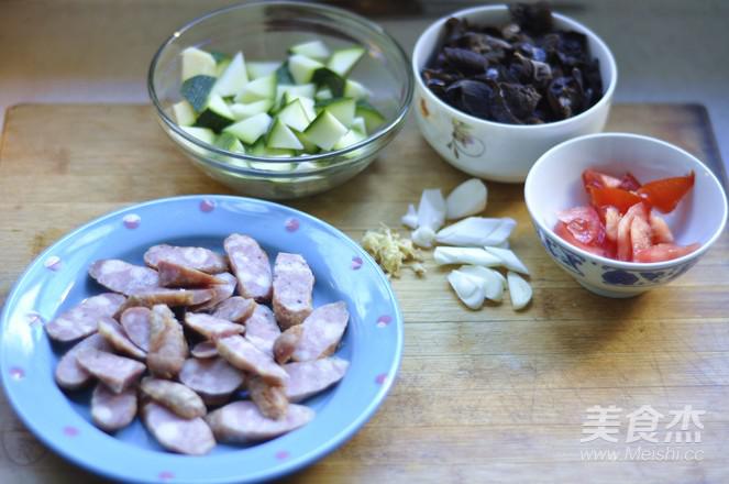 將西葫蘆洗凈切成小塊, 香腸切片, 木耳洗凈撕碎, 西紅柿切成小塊,蔥姜蒜切碎備用;