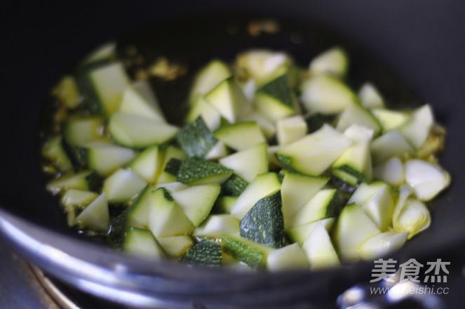 翻炒至西葫蘆表皮變為翠綠色, 加入木耳、鹽、味精、五香粉等