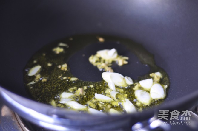 炒鍋上火,熱鍋涼油,放入蔥姜蒜爆香