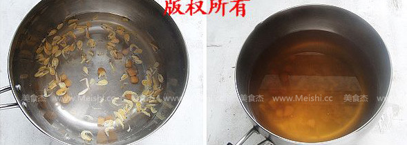 2.將蝦米和干貝放入鍋中煮,煮開的湯里,加入適量的蠔油、醬油繼續煮