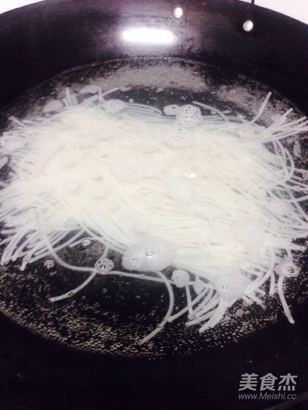 把生抽,蠔油,雞精和食鹽放入碗中 加入適量的開水調成湯汁。把煮熟的米粉,撈出放入湯汁中
