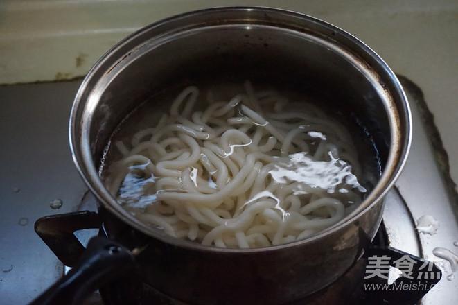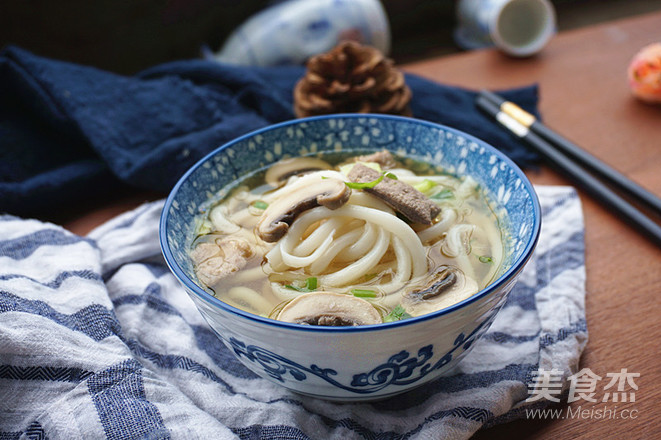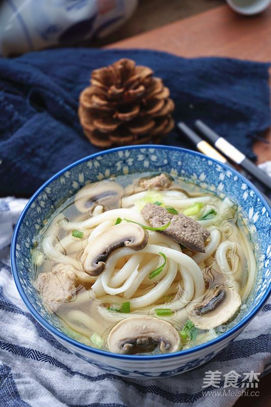把煮好的烏冬面撈放碗里,然后把豬肝湯勺入即可