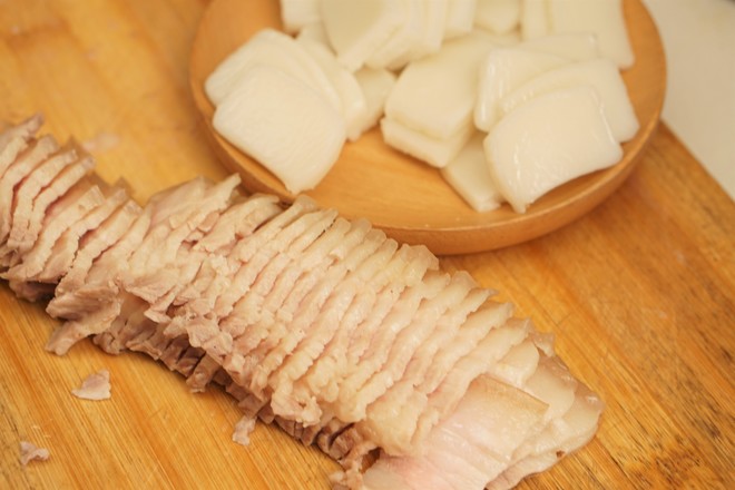 2.五花肉提前煮熟,在煮的時(shí)候可以適當(dāng)加入一兩片姜和少許酒,肉煮到用筷子可以扎動(dòng)即可,切片待用