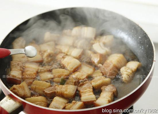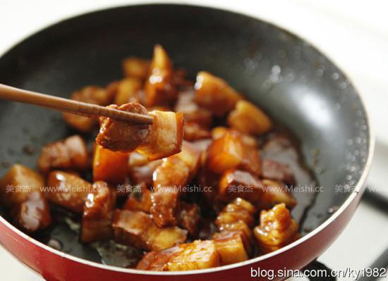 5.馬上把焯好的五花肉放入,迅速翻炒使肉的表面都裹上糖色;然后,倒入料酒、醬油、蔥段和姜片翻炒均勻,加入適量的水沒過五花肉,大火燒開后,轉(zhuǎn)成小火,蓋上蓋子燉1個(gè)小時(shí)左右